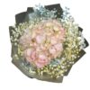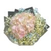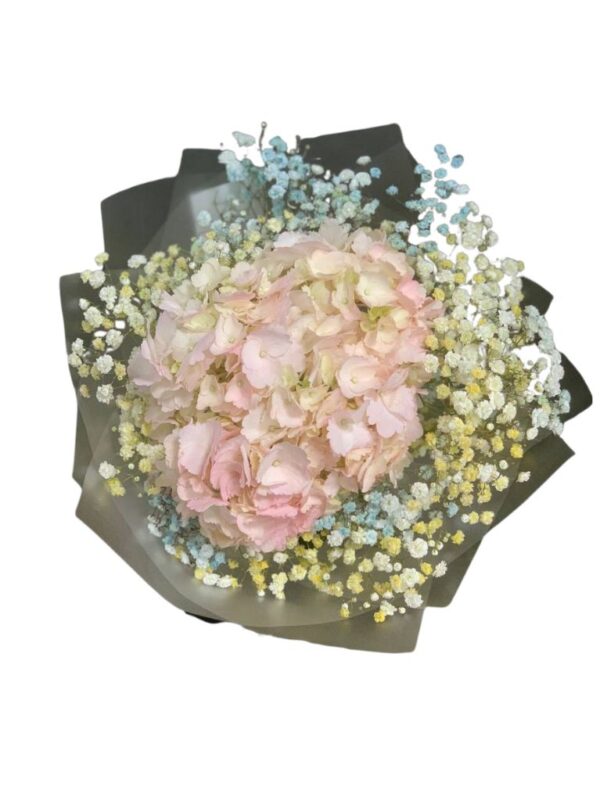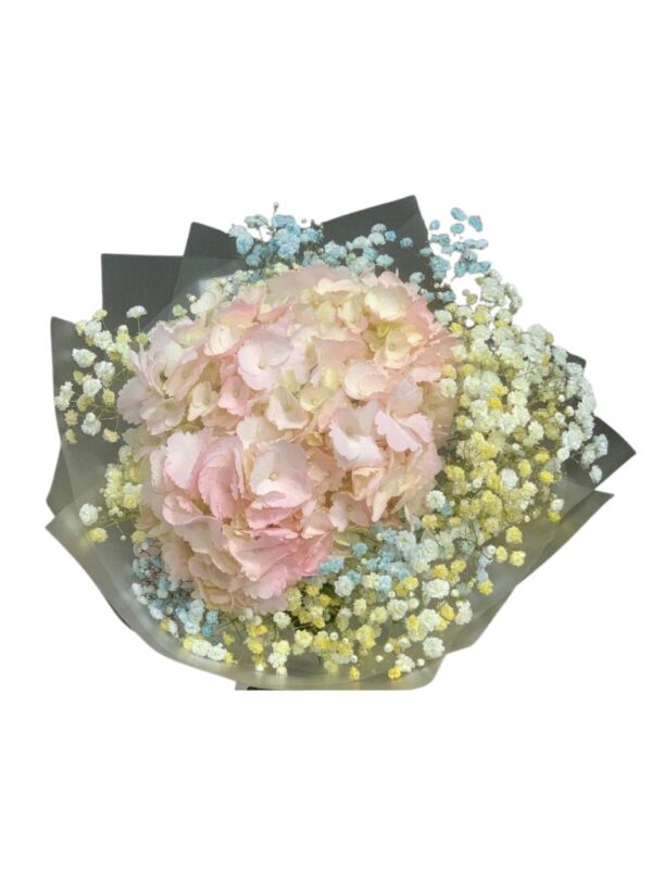 Tato originální kytice spojuje jemnost růžových hortenzií s hravostí barevné gypsophily. Kombinace pastelově růžové, žluté a modré vytváří něžný a veselý kontrast, který působí jako malovaný obraz plný radosti.
